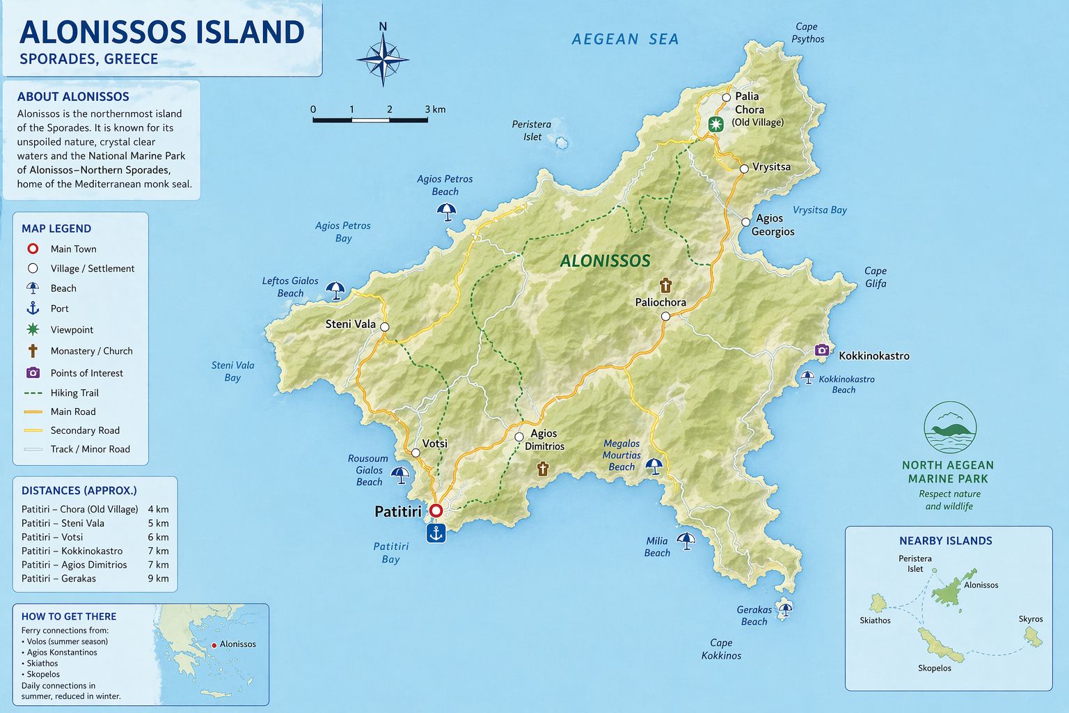 Alonissos Greece Sailing Guide. Alonissos is located in the Northern Sporades east of Skopelos in the western Aegean Sea in Greece at approximately 39°09′N 23°52′E. The island forms part of a dispersed island group including Peristera and other smaller islands, creating a semi-sheltered regional environment depending on wind direction. The principal port is Patitiri on the south-east coast.