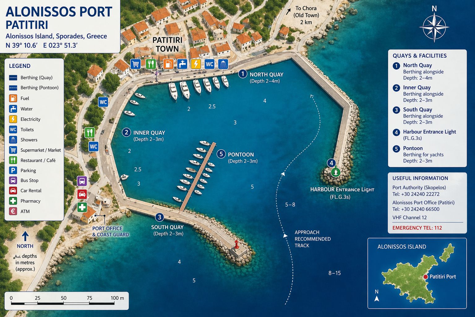 There is no full-service marina on Alonissos. Berthing is centred on Patitiri Port on the south-east coast, where vessels berth stern-to or alongside on town quays. Depths are generally 4–7 m with limited space and manoeuvring area constrained by ferry traffic. Shelter is adequate under northerly conditions but reduced under southerly winds. Water and electricity are available at quay points with metered supply.