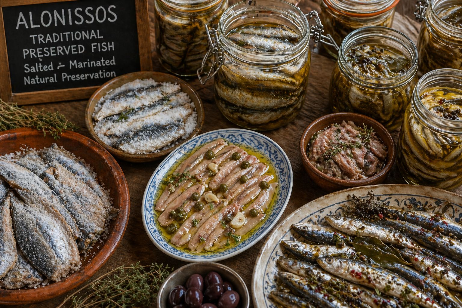 Island-specific products include olive oil from extensive groves and small-scale honey production from thyme and mixed flora. Alonissos is also associated with preserved fish preparations, including salted or marinated small fish, reflecting traditional storage methods.
