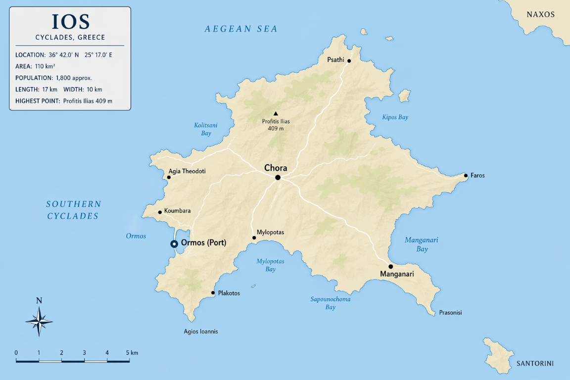 Ios Greece Sailing Guide. Ios is located in the southern Cyclades of the Aegean Sea within Greece at approximately 36°43′N 25°17′E. The island lies between Naxos to the north and Santorini to the south within a high-energy Aegean sector with direct exposure to prevailing northerly winds. The principal harbour is Ormos Iou (Ios Port) on the west coast.