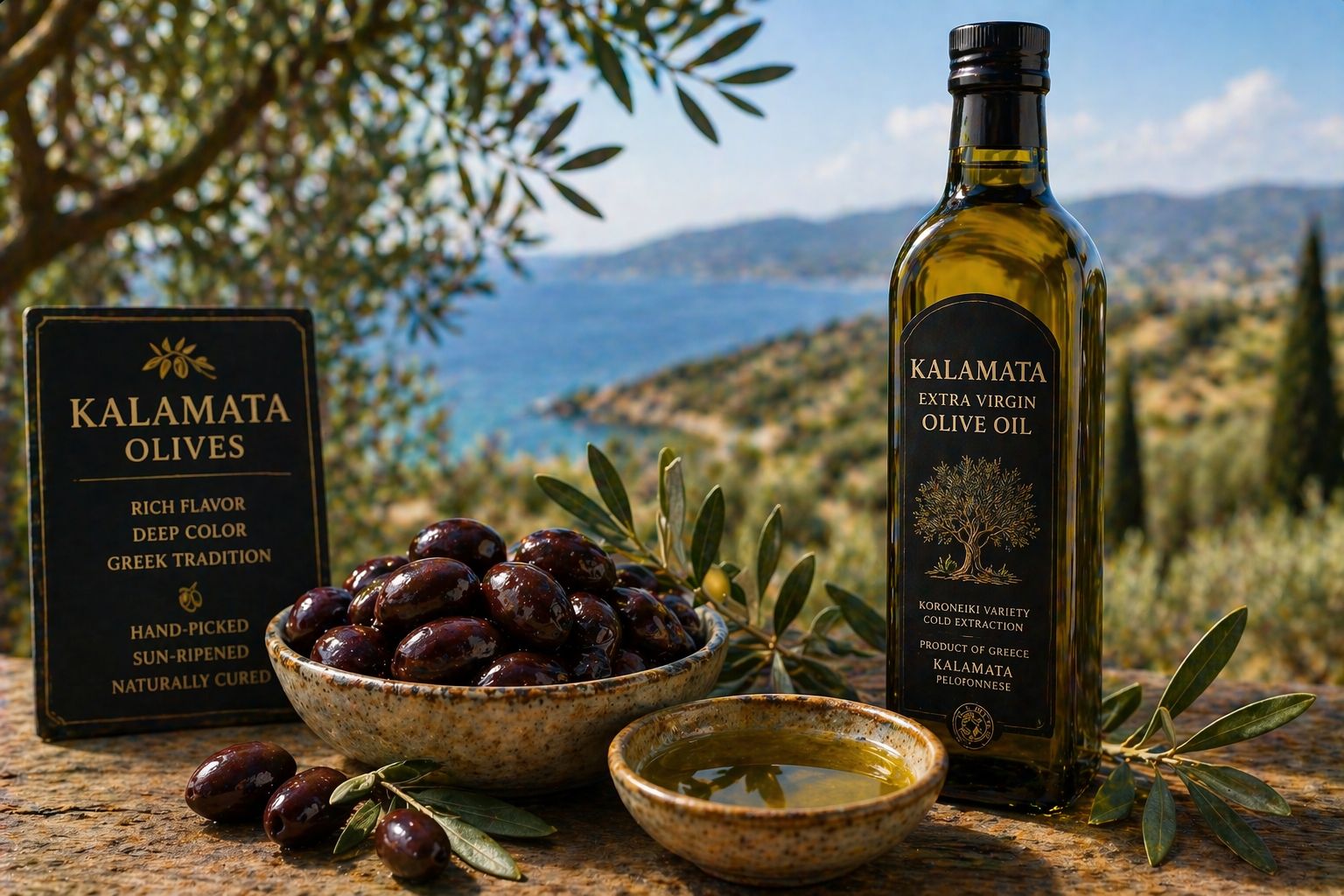 Local products are defined by Kalamata olives and Kalamata olive oil, both produced in the surrounding Messenia region, along with citrus, vegetables, and wine. Olive oil forms the primary base for cooking, and regional agricultural output defines the food profile.