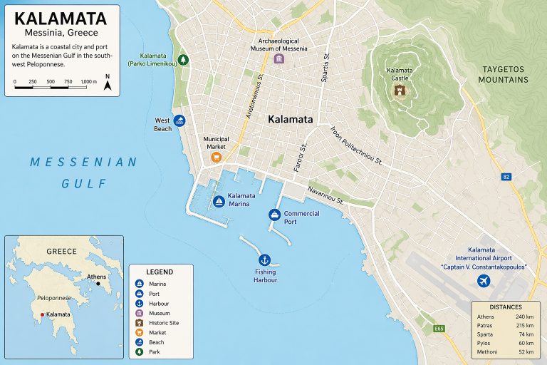 Kalamata Greece Sailing Guide. Kalamata is located on the southern Peloponnese at the head of the Messenian Gulf within Greece at approximately 37°02′N 22°07′E. The port is a combined commercial harbour and marina complex serving regional traffic and providing a primary access point to the south-west Peloponnese. The coastline forms a broad gulf with moderate shelter compared to open Aegean conditions.