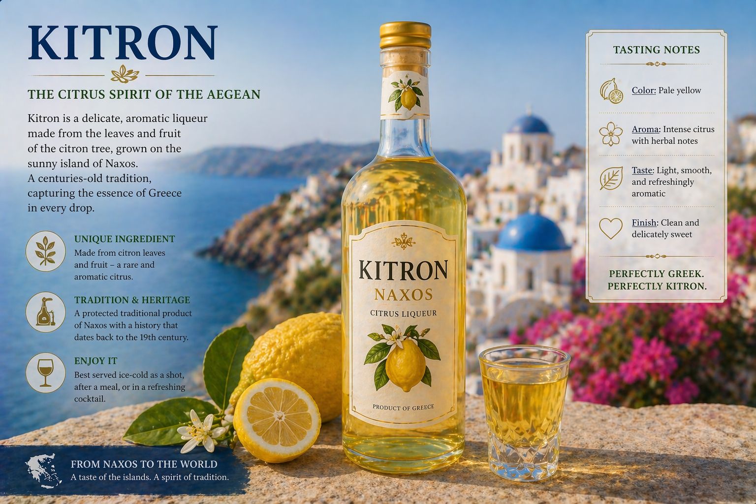 Beer, wine, and spirits across the Greek islands are locally produced and widely available through tavernas, small bars, and provisioning outlets. Beer is predominantly lager, with domestic brands including Mythos, Alfa, Fix, and Vergina alongside imported products; and over 100 microbreweries operate on several islands with limited distribution. Wine is region-specific, with white varieties dominant in the islands, including Assyrtiko, Moschofilero, and Roditis, alongside local table wines served in bulk; retsina remains in circulation as a resin-flavoured wine. Distilled products include ouzo (anise-based), tsipouro (grape marc distillate), raki or tsikoudia (Crete), souma (fig or grape distillate in eastern Aegean islands), and kitron (citrus liqueur from Naxos), with alcohol strength typically in the 37–45% range and higher for unregulated local distillations.