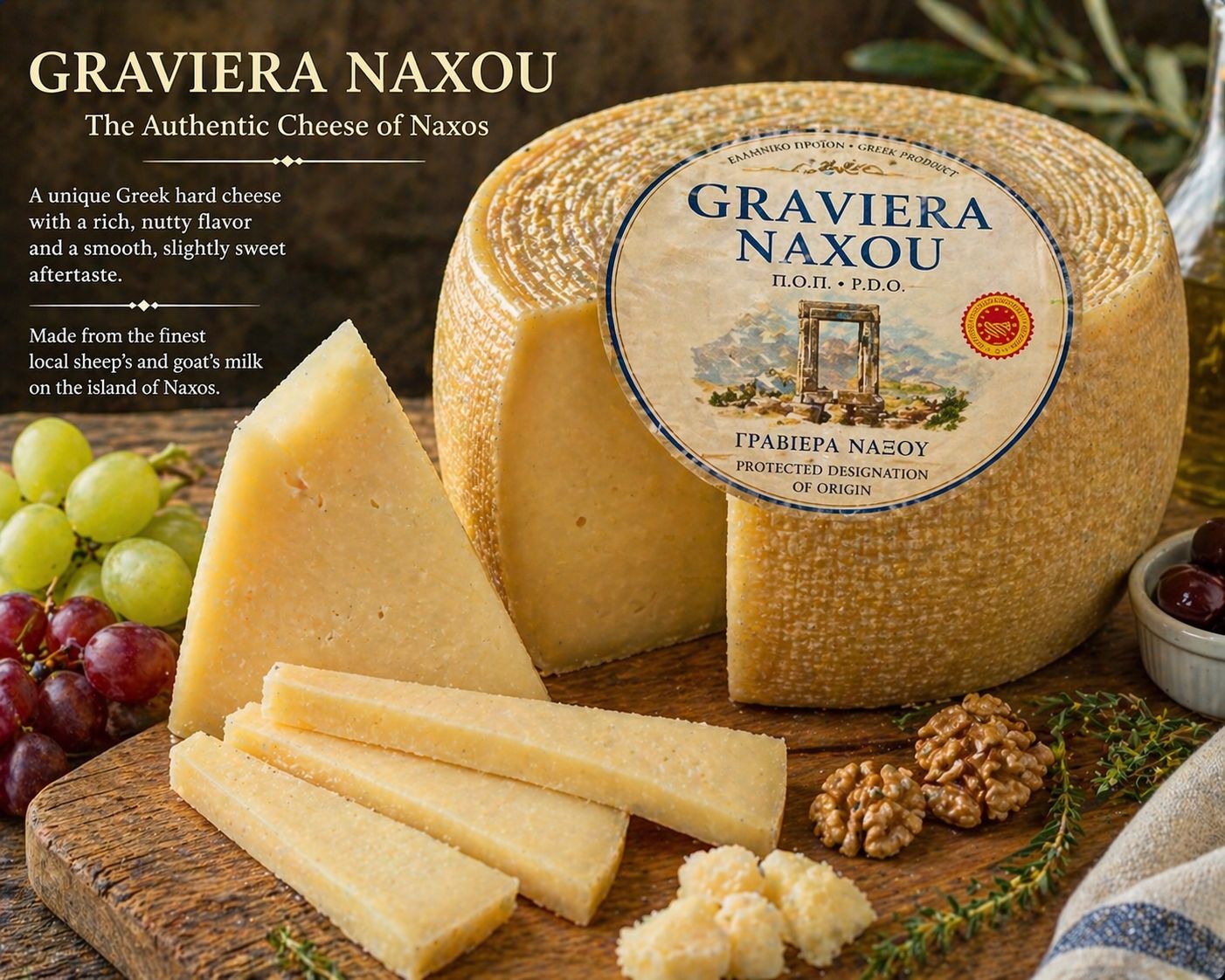 Naxos has several defined local products based on established agricultural production. Graviera Naxou is the primary product, a hard cheese produced from cow and sheep milk with consistent quality and island-wide distribution, along with arseniko, a stronger aged cheese. Naxos potatoes are a recognised product grown in fertile inland plains with high yield and widespread use in local dishes. Additional products include local meats, citrus, wine, and small-scale honey production