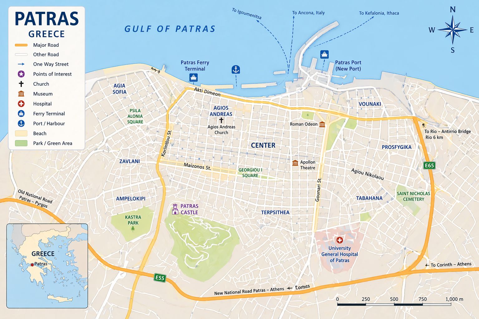 In the Byzantine and later Venetian and Ottoman periods, the city continued to function as a strategic harbour, though control shifted between powers reflecting wider regional conflicts. Patras played a role in the early stages of the Greek War of Independence, after which it developed into a modern port city. In the 19th and 20th centuries, expansion of harbour facilities and transport links reinforced its position as a principal gateway between Greece and western Europe. Today, Patras remains one of the country’s major ports, supporting ferry routes, commercial shipping, and regional maritime activity.