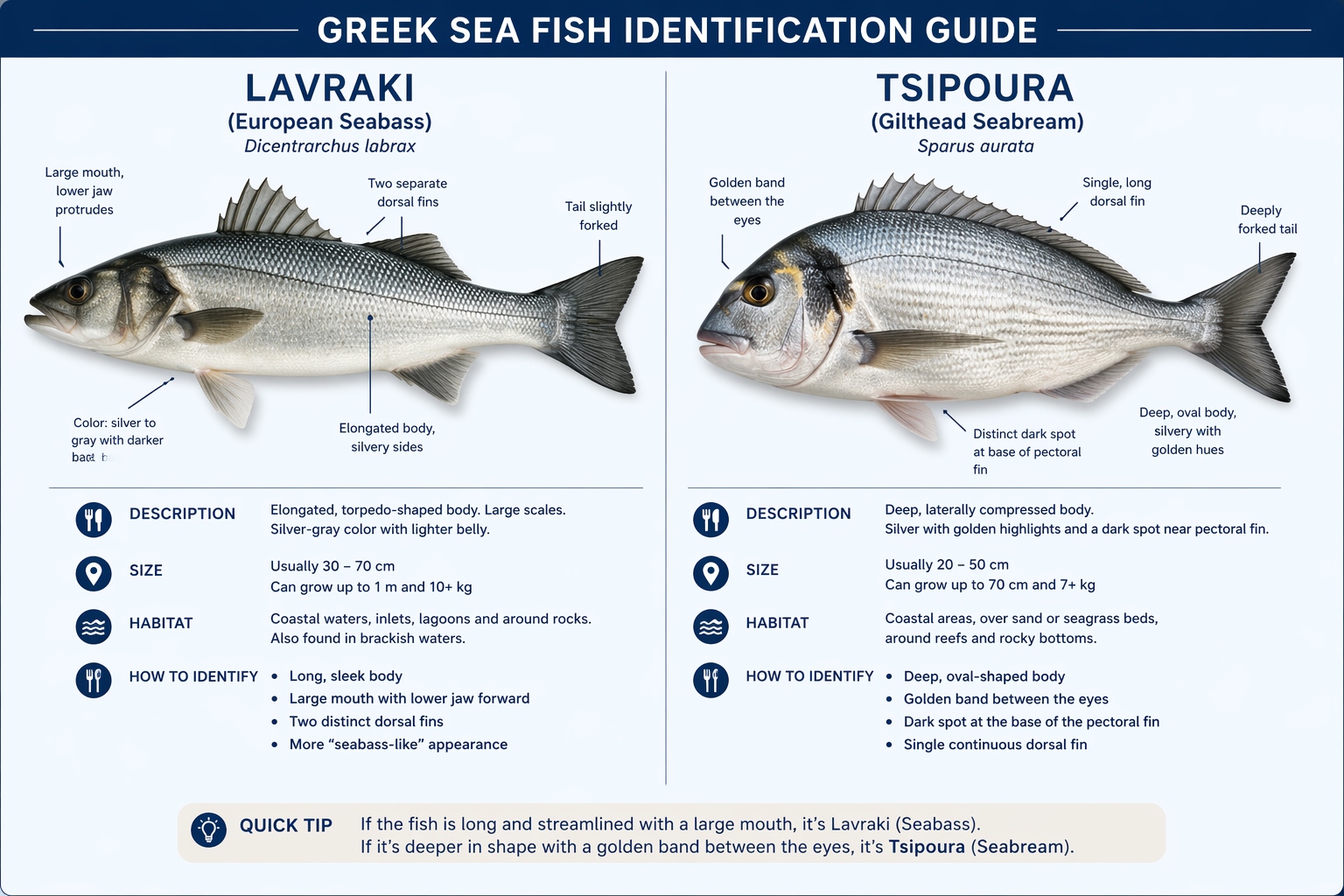 Fish Markets. Fish supply is strong and consistent, supported by both local fisheries in the Gulf of Patras and wider Ionian distribution networks. The primary supply point is the Patras fish market and harbour-side vendors, operating early morning aligned with landings. Species available include lavraki (European seabass), tsipoura (gilthead seabream), barbouni (red mullet), sardines, anchovies, squid, octopus, and seasonal varieties. Volume is moderate to high with reliable daily availability. Additional fishmongers are distributed across the city with consistent cold-chain supply.