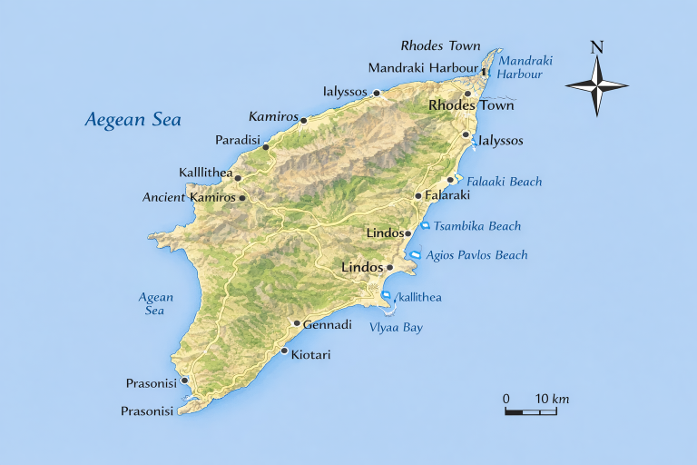 Rhodes Greece Sailing Guide. Rhodes is located in the south-eastern Aegean within the Dodecanese group of Greece at approximately 36°26′N 28°13′E. The island lies close to the Turkish coast with open sea exposure to the east and south. The principal port and marina facilities are located at Rhodes town on the northern tip.