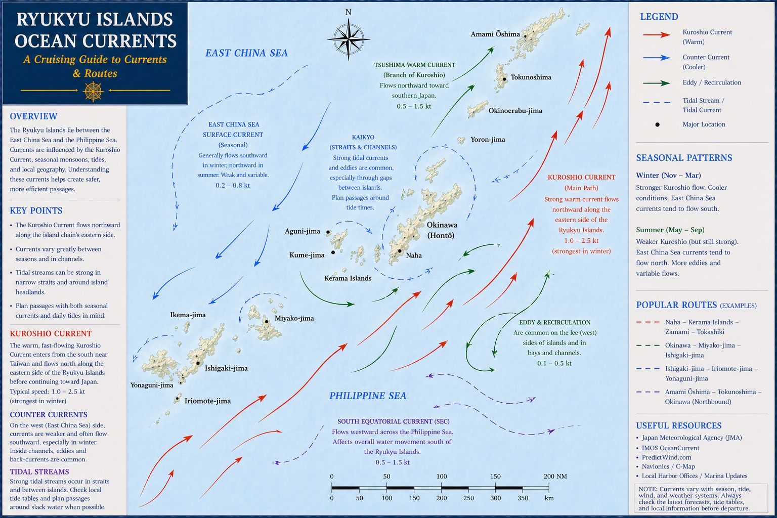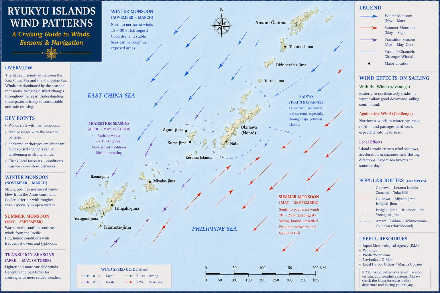 Weather in the Ryukyu Islands is shaped by warm ocean currents, seasonal winds, and a tropical–subtropical climate that feels very different from mainland Japan. Winters are mild, with steady northeasterlies and relatively calm seas, while spring brings shifting winds, early humidity, and the first signs of the rainy season. Summer is dominated by high heat, strong sunlight, and the possibility of typhoons, large, slow‑moving systems that can affect the entire chain from Okinawa to Yonaguni. Autumn is often the most settled season, with warm water, lighter winds, and clear visibility. Across the year, localised squalls, fast‑moving showers, and strong tidal currents can influence short‑range passages, especially around reef systems and narrow channels. Understanding these seasonal patterns is essential for planning safe movements between islands, choosing anchorages, and timing longer passages through the chain.