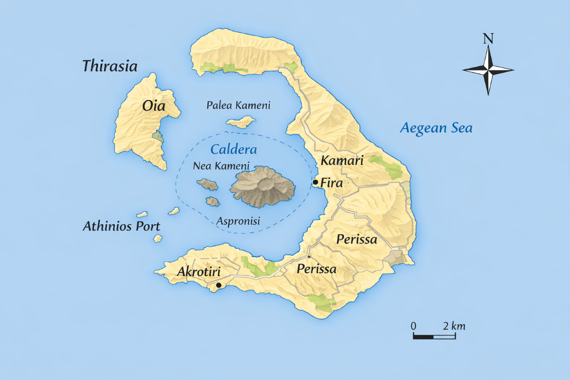 Santorini Greece Sailing Guide. Santorini is located in the southern Cyclades of the Aegean Sea in Greece at approximately 36°24′N 25°26′E. The island forms part of a volcanic caldera with steep cliffs on the west side and open coasts to the east and south-east. The principal commercial port is Athinios on the west coast within the caldera.