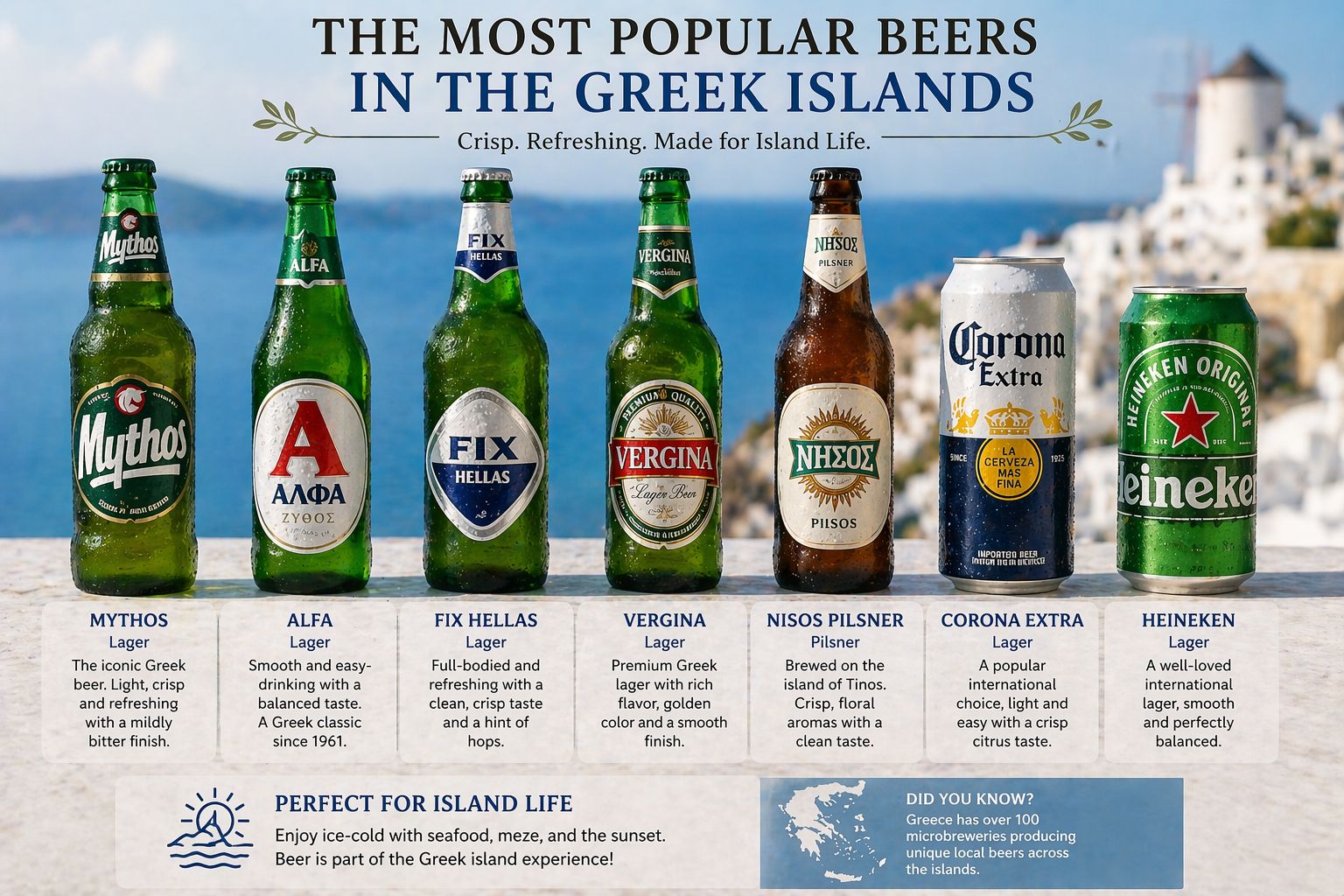 Beer, wine, and spirits across the Greek islands are locally produced and widely available through tavernas, small bars, and provisioning outlets. Beer is predominantly lager, with domestic brands including Mythos, Alfa, Fix, and Vergina alongside imported products; and over 100 microbreweries operate on several islands with limited distribution. Wine is region-specific, with white varieties dominant in the islands, including Assyrtiko, Moschofilero, and Roditis, alongside local table wines served in bulk; retsina remains in circulation as a resin-flavoured wine. Distilled products include ouzo (anise-based), tsipouro (grape marc distillate), raki or tsikoudia (Crete), souma (fig or grape distillate in eastern Aegean islands), and kitron (citrus liqueur from Naxos), with alcohol strength typically in the 37–45% range and higher for unregulated local distillations.