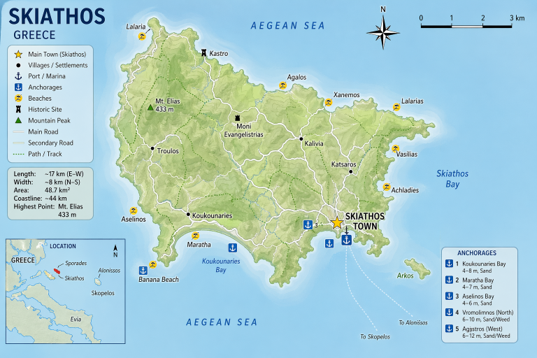 Meltemi winds, though moderated compared to the central Cyclades due to partial shelter from surrounding Sporades islands. Approaches are clear with depths exceeding 50–100 m offshore, reducing to 10–20 m near the coast and 4–8 m in harbour areas. The primary approach is to Skiathos Port on the south-east coast, with a direct entry but high traffic from ferries and commercial vessels requiring controlled manoeuvring and awareness of wash.