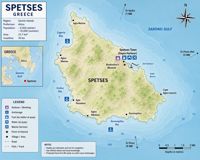 Spetses Greece Sailing Guide. Spetses is located in the Saronic Gulf south of the Argolid peninsula in Greece at approximately 37°15′N 23°09′E. The island lies within relatively sheltered waters with moderate traffic from Piraeus and nearby islands. The principal port is Dapia Harbour on the north coast, with additional harbour at Baltiza.