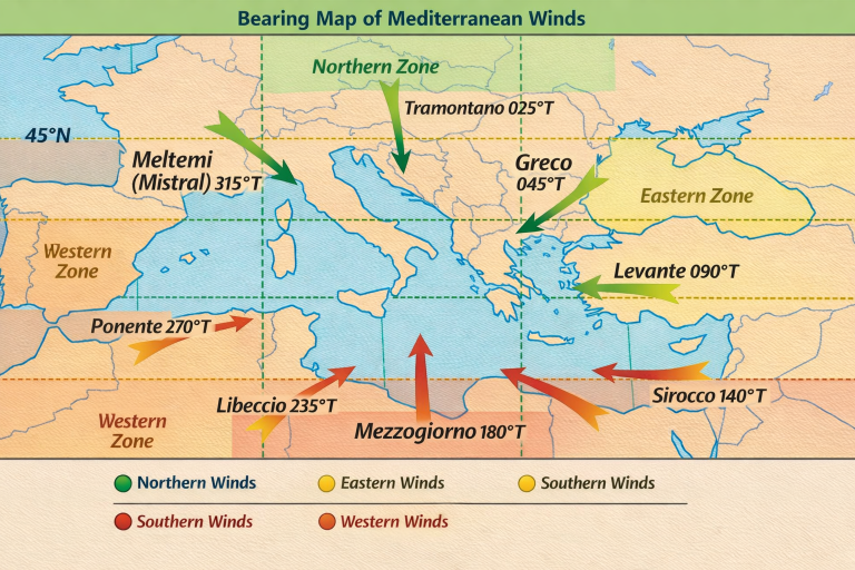 Weather along the Tunisian coast is shaped by the broader patterns of the central Mediterranean, with seasonal variations that influence routing and sea state. Summer conditions are generally stable, with predictable northerlies and thermal breezes supporting reliable coastal movement. Winter introduces more variable weather, with strong westerlies, northwesterlies, and occasional Sirocco events producing steep seas and reduced visibility. The Cap Bon Peninsula can experience significant wind acceleration during regional systems, affecting approaches and anchoring conditions. The Gulf of Gabès is influenced by tidal effects and localised wind patterns that shape sea‑state behaviour in shallow areas. Seasonal patterns are well‑defined, with summer offering the most predictable conditions and winter requiring more conservative planning for offshore passages.