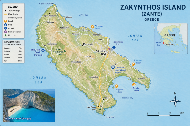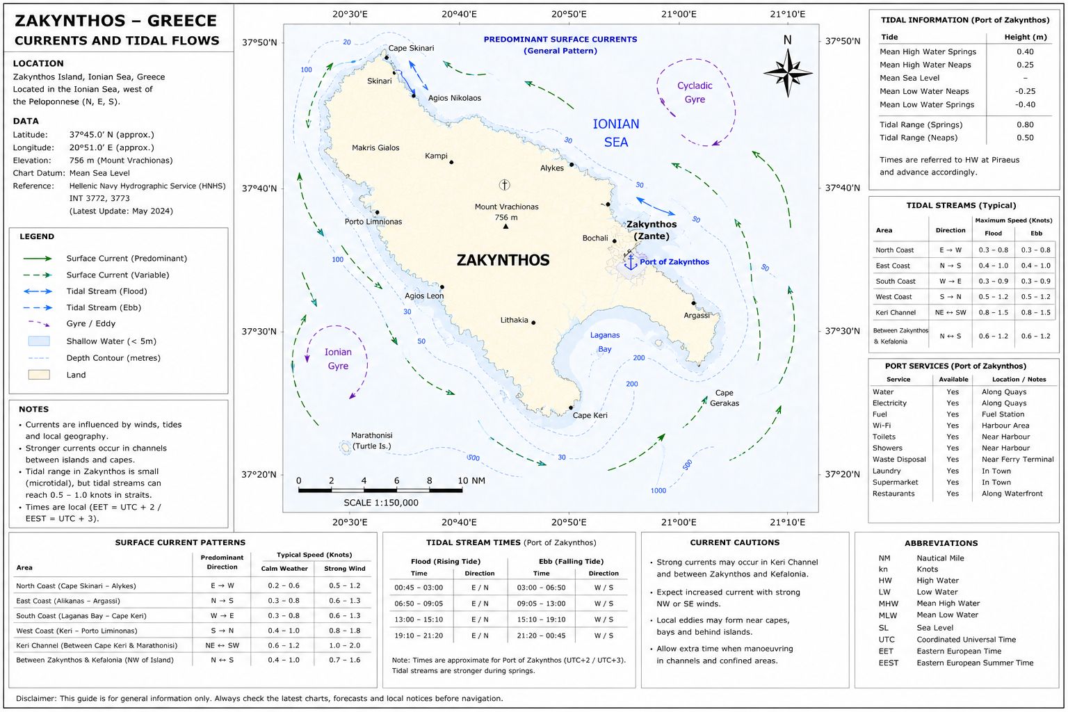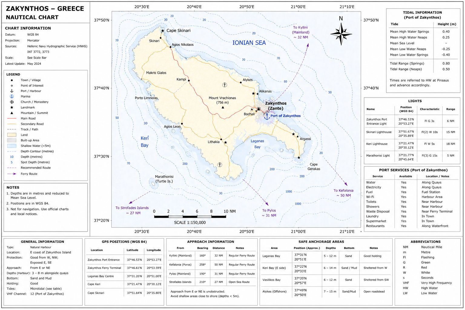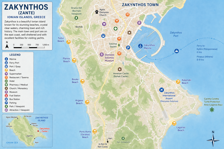 Zakynthos Greece Sailing Guide. Zakynthos is located in the southern Ionian Sea within Greece at approximately 37°47′N 20°54′E. The principal port is Zakynthos Town on the east coast, facing the mainland and forming a semi-exposed harbour with limited breakwater protection. The island has a varied coastline with steep western shores exposed to open sea and more accessible eastern sectors with bays and anchorages.