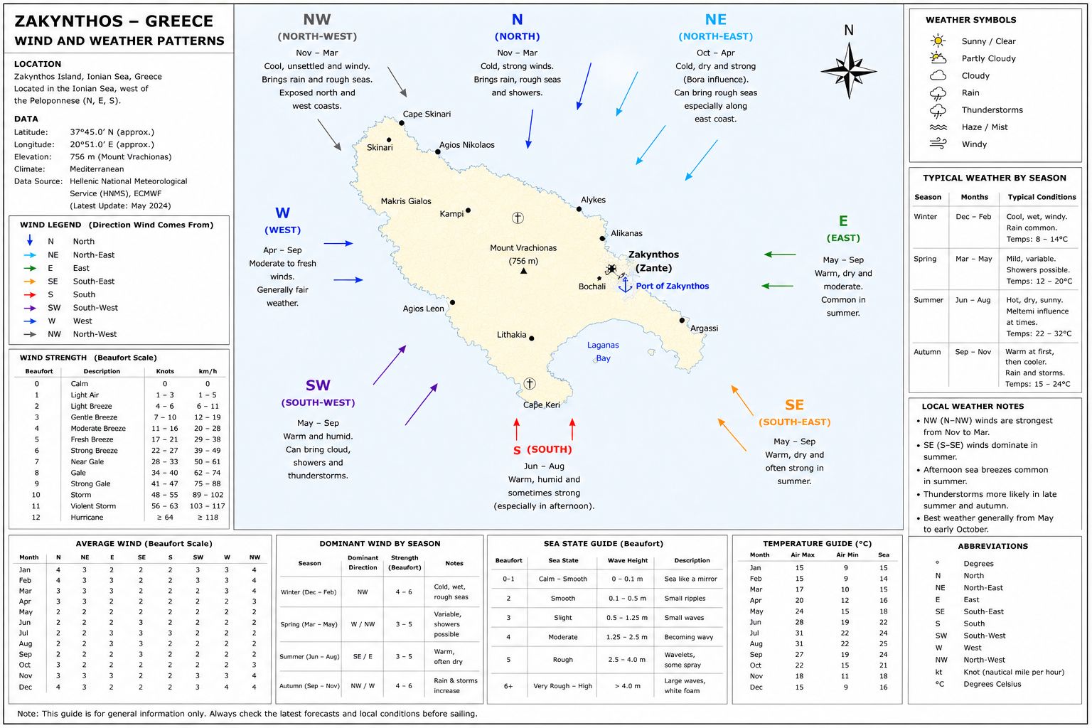 Local weather around Zakynthos is typically Mediterranean, with hot, dry summers and mild, wetter winters. From May to September, winds are generally NW–W at 10–20 knots, occasionally reaching 20–25 knots in the afternoon sea breeze, with calm mornings common. Unlike the Aegean, the Meltemi has limited influence here, though stronger NW winds can still build short seas offshore. Autumn and winter bring more variable conditions with S–SW winds 15–30 knots, associated with passing lows, producing swell and occasional squalls. Visibility is usually excellent in summer, with sea states slight to moderate on the east coast but can become moderate to rough in prolonged westerlies. Overall, the most stable and predictable conditions for sailing are from late spring to early autumn.