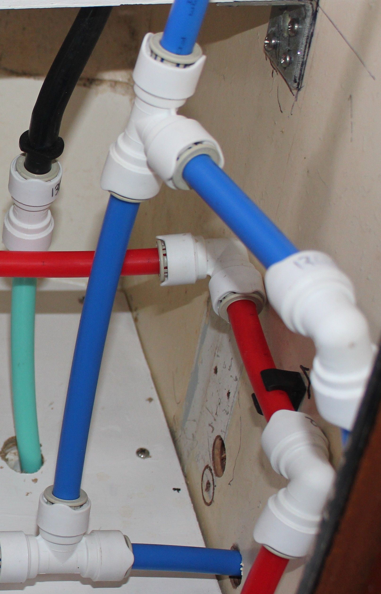 Push-fit systems (e.g., Whale, John Guest) allow rapid installation. I installed the Whale Quick Fit 15 system on my own boat. To summarize. The Whale system uses semi‑rigid 15 mm OD polyethylene pipe. The system uses push‑fit connectors (tees, elbows, straight connectors and valves). It utilizes a double‑gripper collet system for retention, with an internal support ring to stabilise the O‑ring seal and a cage collet design to prevent leaks near tight bends. The internal support ring prevents O‑ring distortion and maintains seal integrity under pressure or temperature changes. The advantages are being great for retrofits, only tool required is the cutters to ensure clean and square pipe cut for insertion, and reuseable, so opening is easy. You must use recommended tubing and tube cutters only, using a blade or hacksaw is doomed to failure. Note, if my water system is pressurized and I turn off the pump and leave the boat for several weeks, when I come back and switch on water pump there is no pump turnoff because the system has maintained pressure. Leaks are a think of the past as are hose clamps. Piping is Blue for Cold, Red for Hot Water and Green for Saltwater.
