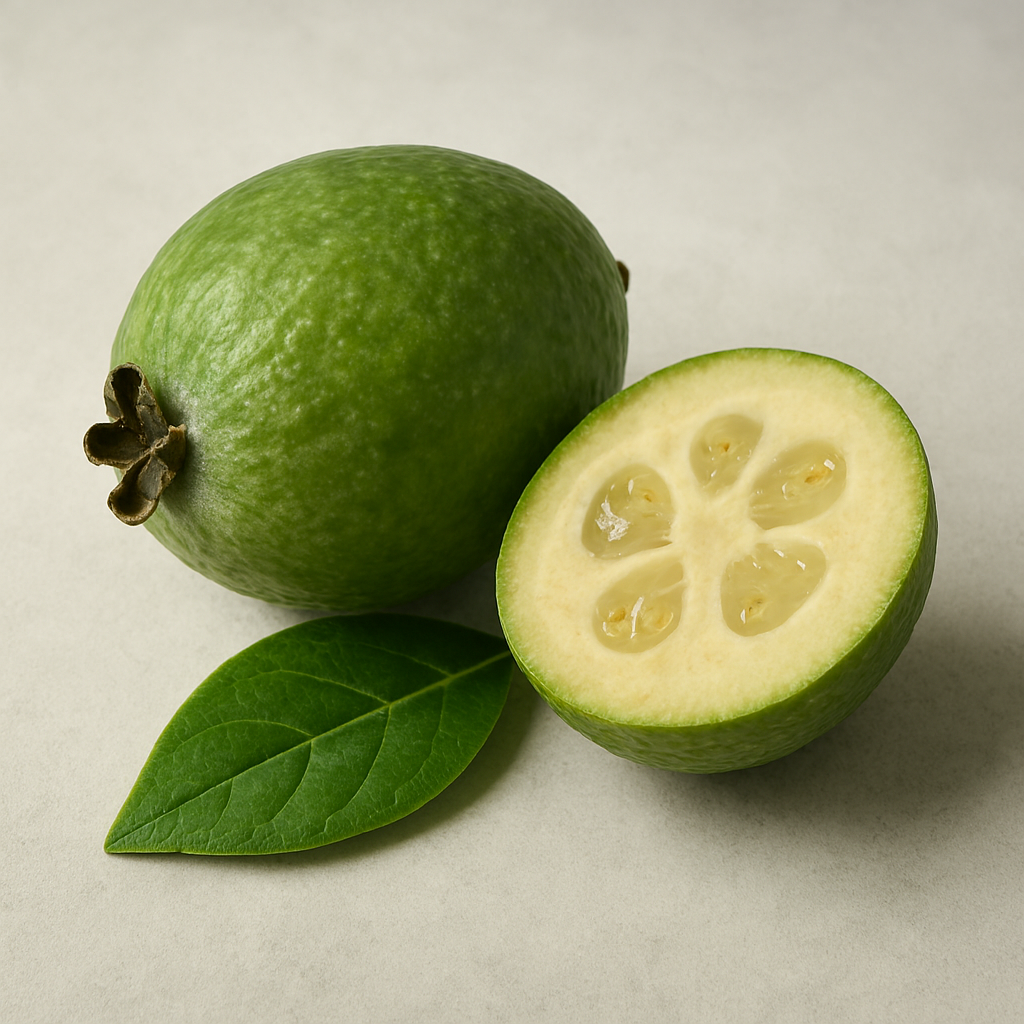 Native to southern Brazil, Paraguay, and Uruguay, now widely grown in New Zealand and temperate-tropical climates. The fruit has a green, slightly rough skin, sometimes with a waxy bloom. The flesh is a creamy, aromatic pulp with edible seeds and a fragrant aroma. The flavor is a sweet tart flavor comprising a blend of mint, pineapple, pear, strawberry, and citrus, with floral undertones. Eat raw and cut in half and scoop out pulp with a spoon. Used in cakes, muffins, ice creams, and sorbets. Made into jams, jellies, chutneys, and syrups. Blended into smoothies, cocktails, and juices.